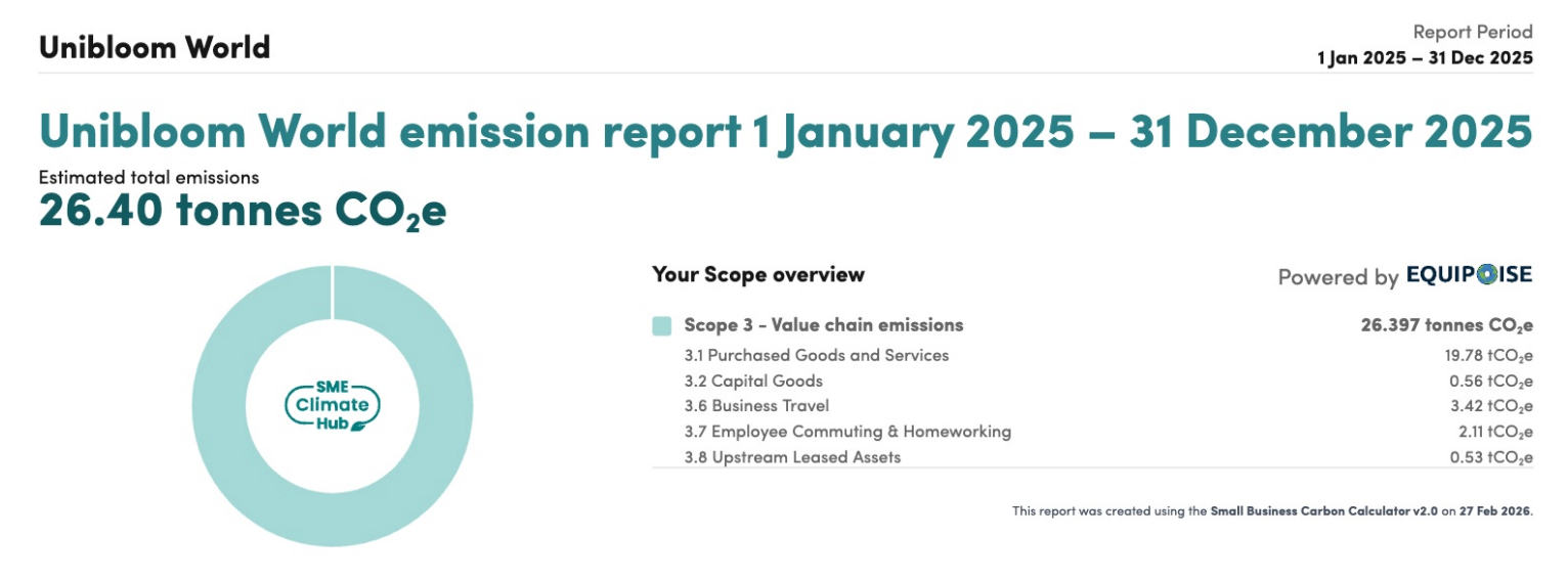 To report our emissions, we have used the SME Climate hub to calculate our Scope 1, 2 and 3. Last year's numbers come from the Unibloom's 2024 carbon footprint report. Our input data comes from an external accounting firm as well as internal information about traveling and commuting for Scope 3. To calculate the total distance for travelling, we have used the great-circle distance (the shortest path through the air), which is the standard method used in climate calculations.